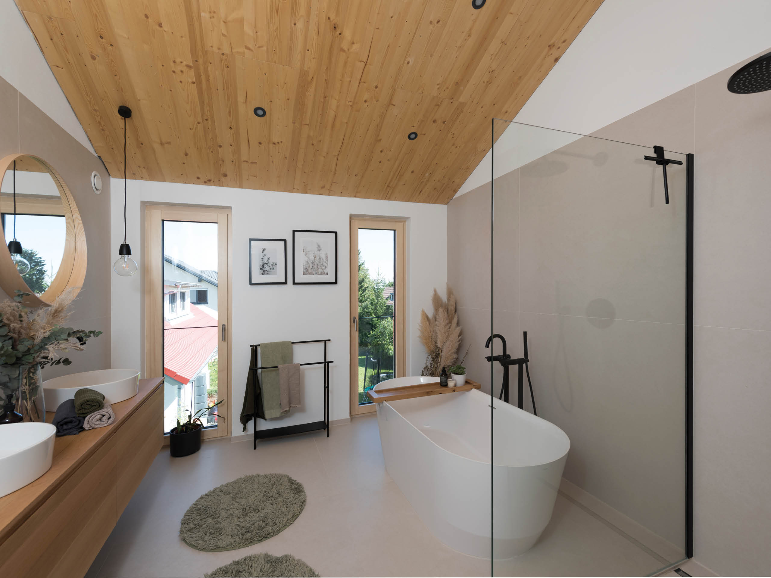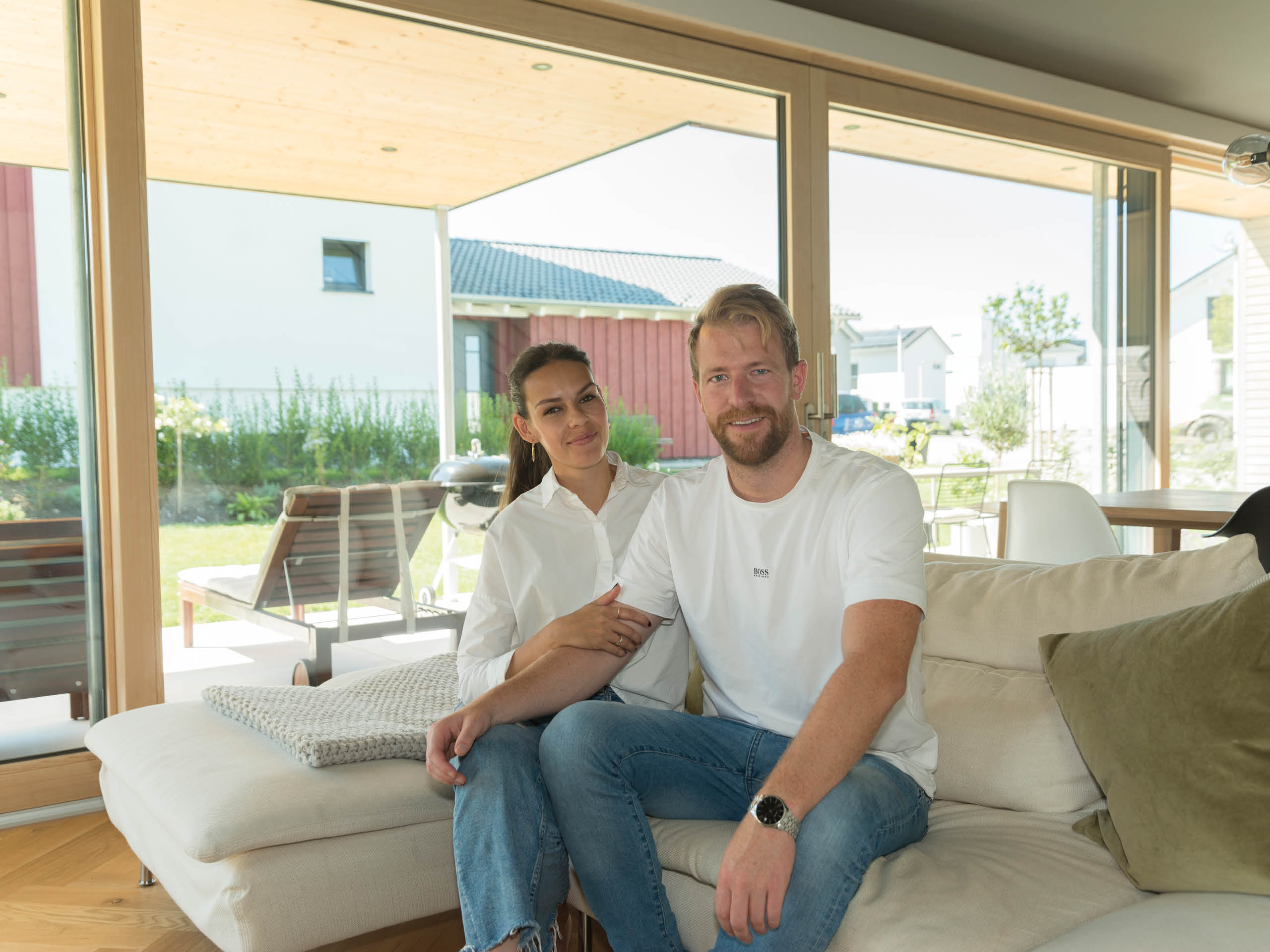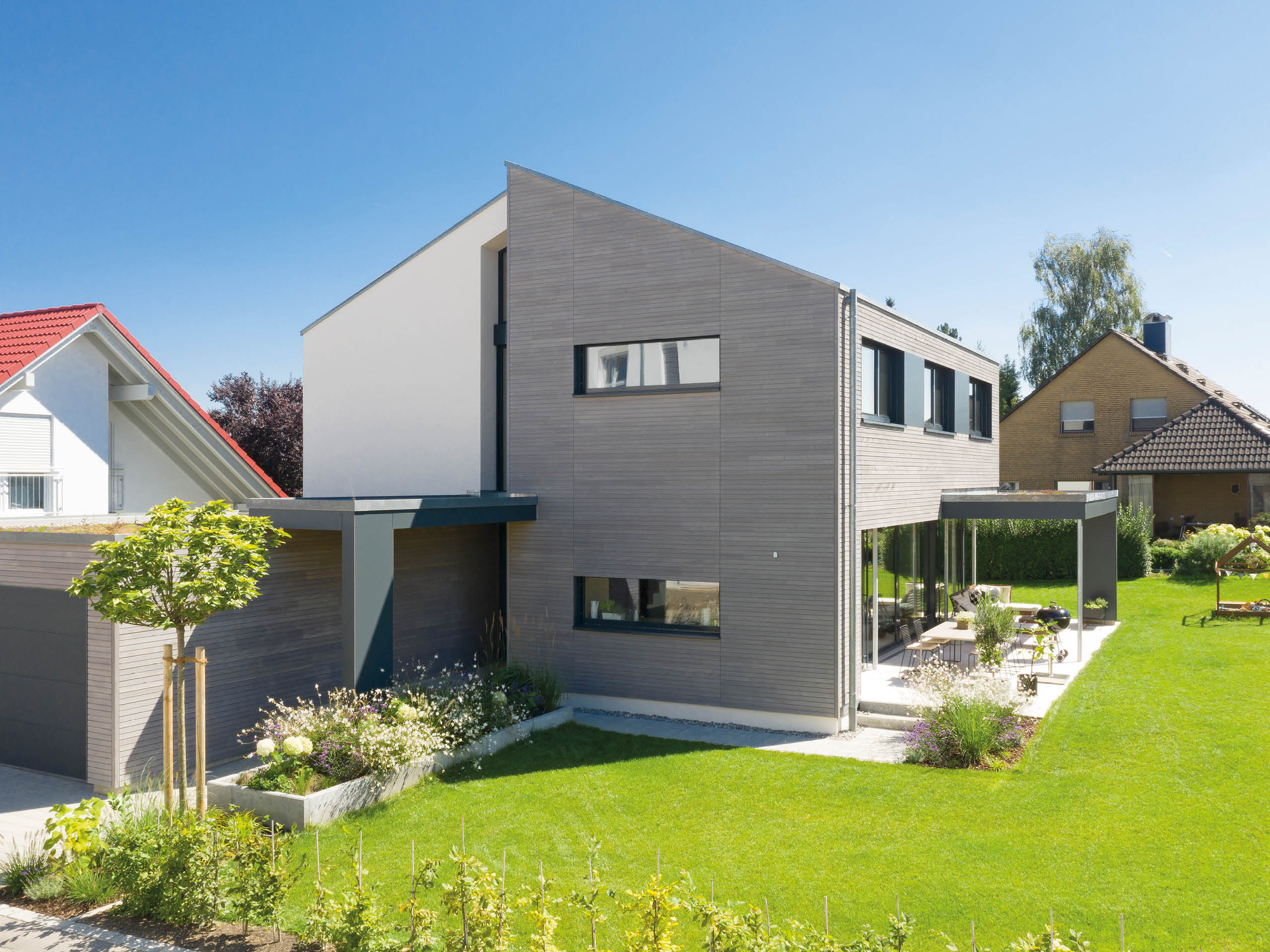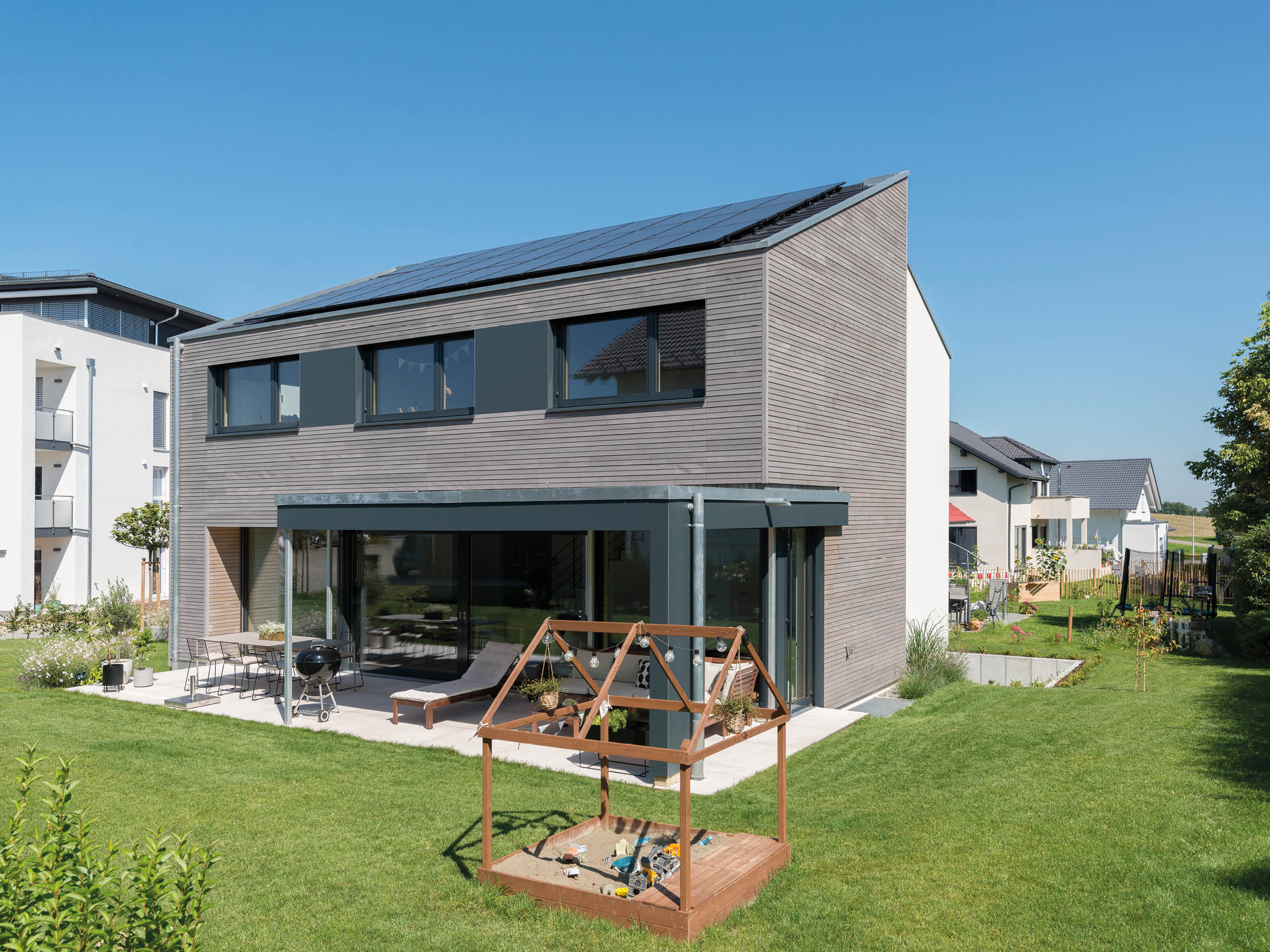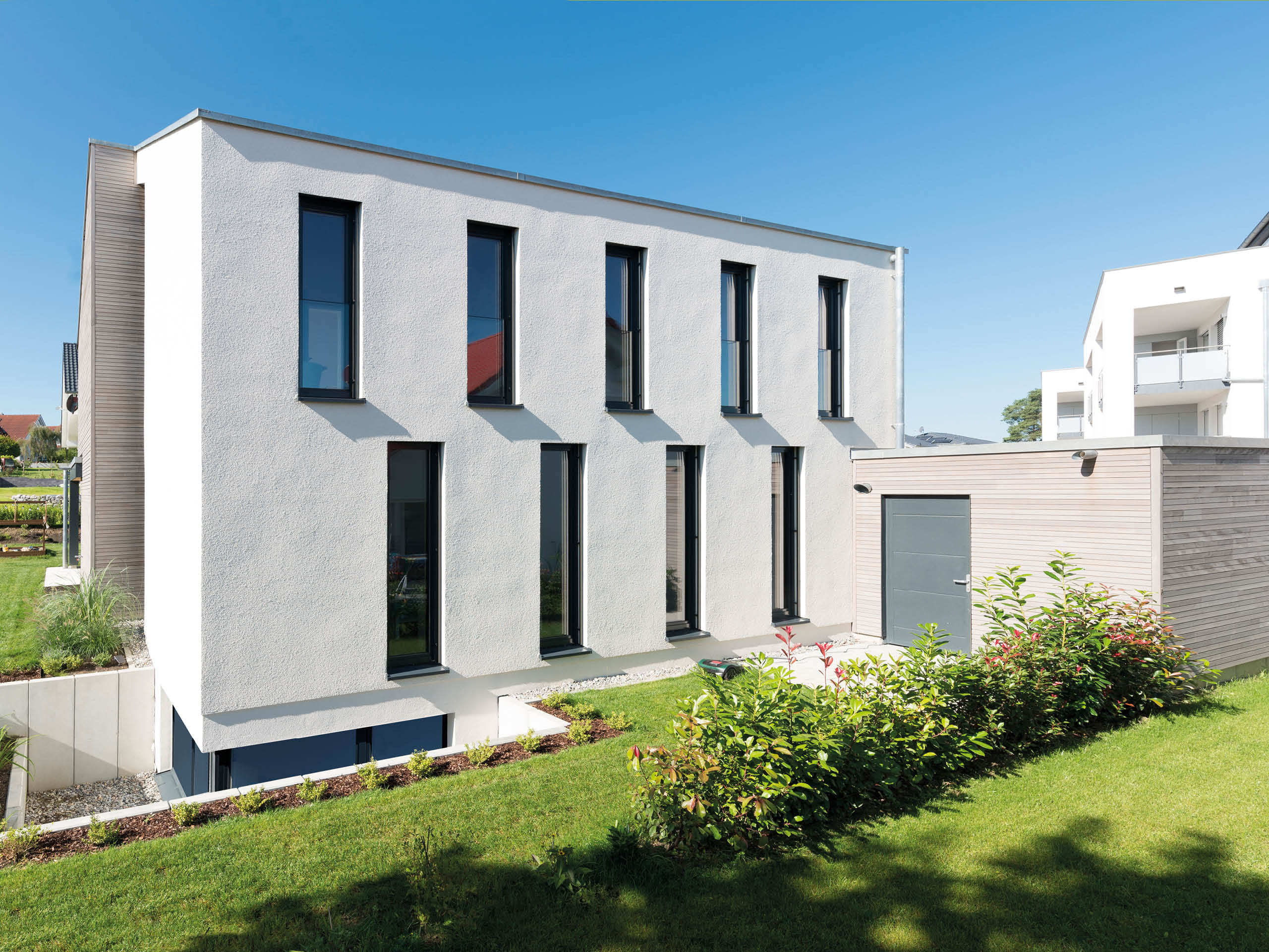 Zwischen der klassisch weiß verputzten und der in graue Holzleisten gehüllten Haushälfte, zieht sich ein elegantes Lichtband bis unters Dach. Dieses Stilelement wird an der Seite durch schlanke Fenster aufgenommen, die stockwerksweise versetzt sind. Komplementär zum überstandslosen Dach steht ein Vordach über Teilen der Terrasse aus dem Baukörper hervor. Und nicht nur dort spielt Sonnenlicht eine zentrale Rolle im Wohnalltag des Plusenergiehauses: „Ich kontrolliere den Stromverbrauch täglich per App und bin begeistert, wie niedrig er ist!“, freut sich Bauherr Thomas Bley.
